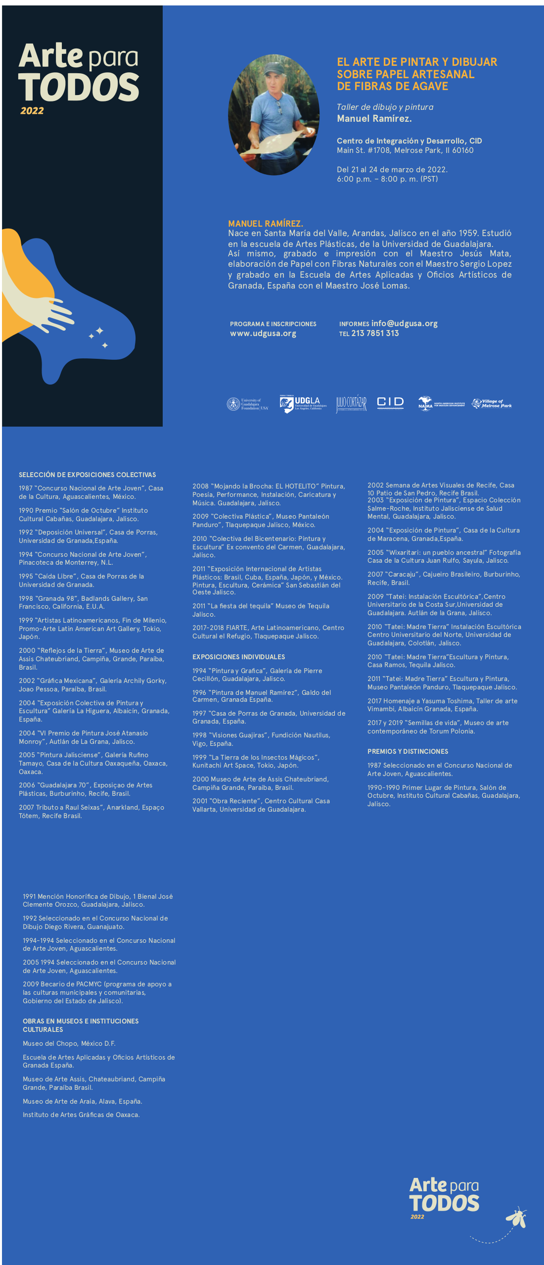 Dentro del ciclo "Arte para todos", la primera actividad en la ciudad de Chicago es el taller El arte de pintar y dibujar sobre papel artesanal de fibras de agave que impartirá el artista plástico Ernesto Flores Gómez, durante cuatro sesiones a realizarse del 21 al 24 de marzo en horario de 6:00 pm a 8:00 pm PST en el del Centro de Integración y Desarrollo CID, Main St. #1708, Melrose Park, II 60160.